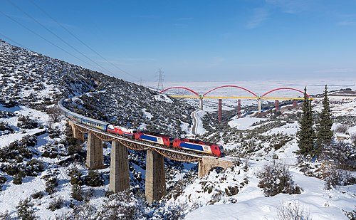 Train circulant sur la ligne Athènes - Thessalonique sur le viaduc de Kifera.